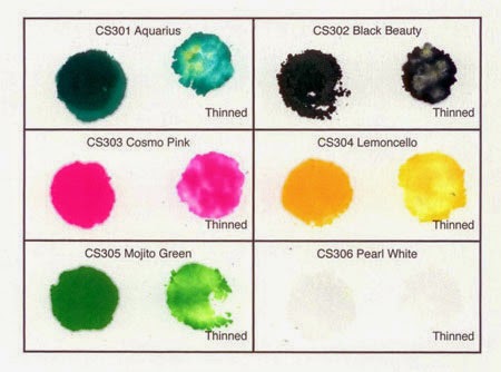 I used the Color Solution Alcohol Inks to do the background first. It was done on digital cardstock that has a glossy type of finish. You can either squirt several alcohol ink colors and the thinner/cleaner onto your craft mat and then lay the paper on top and move it around or you can squirt the Color Solution Ink and thinner/cleaner on top of the paper and place a second piece onto that and smear the colors together. Both methods give some great results. Here is a sampling of the actual colors we have: